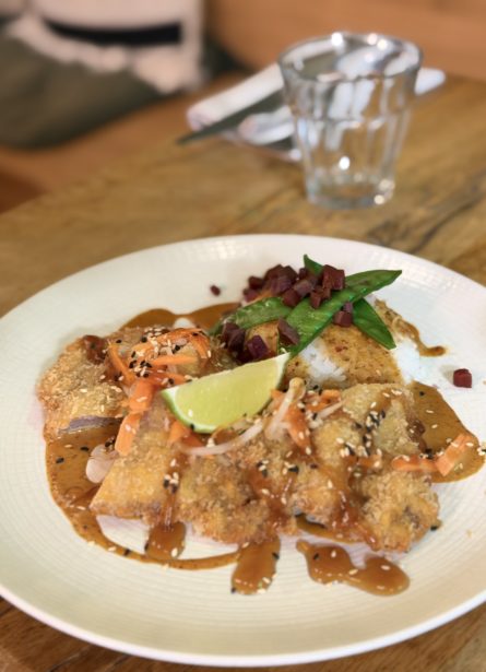 Tonkatsu de veau, riz basmati, sauce saté et teriyaki.